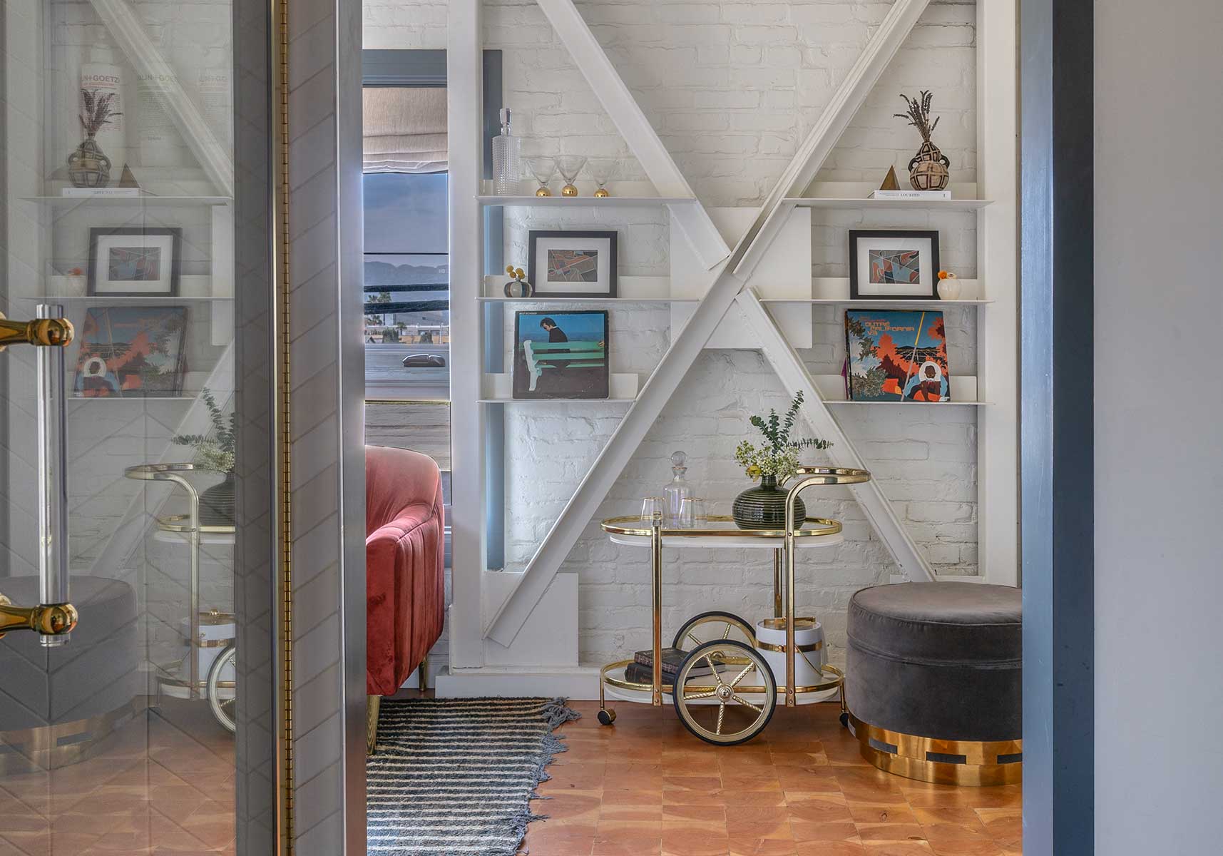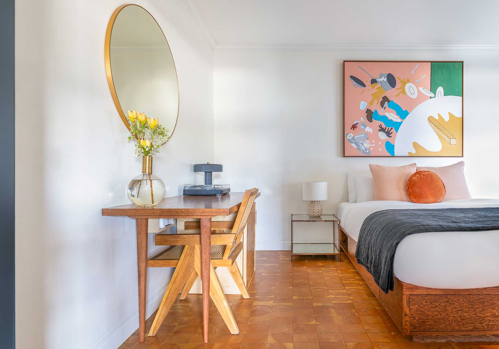 An intimate room with a queen bed, velvet ottoman, petite desk and built-in shelves that evoke mid-century glam.
